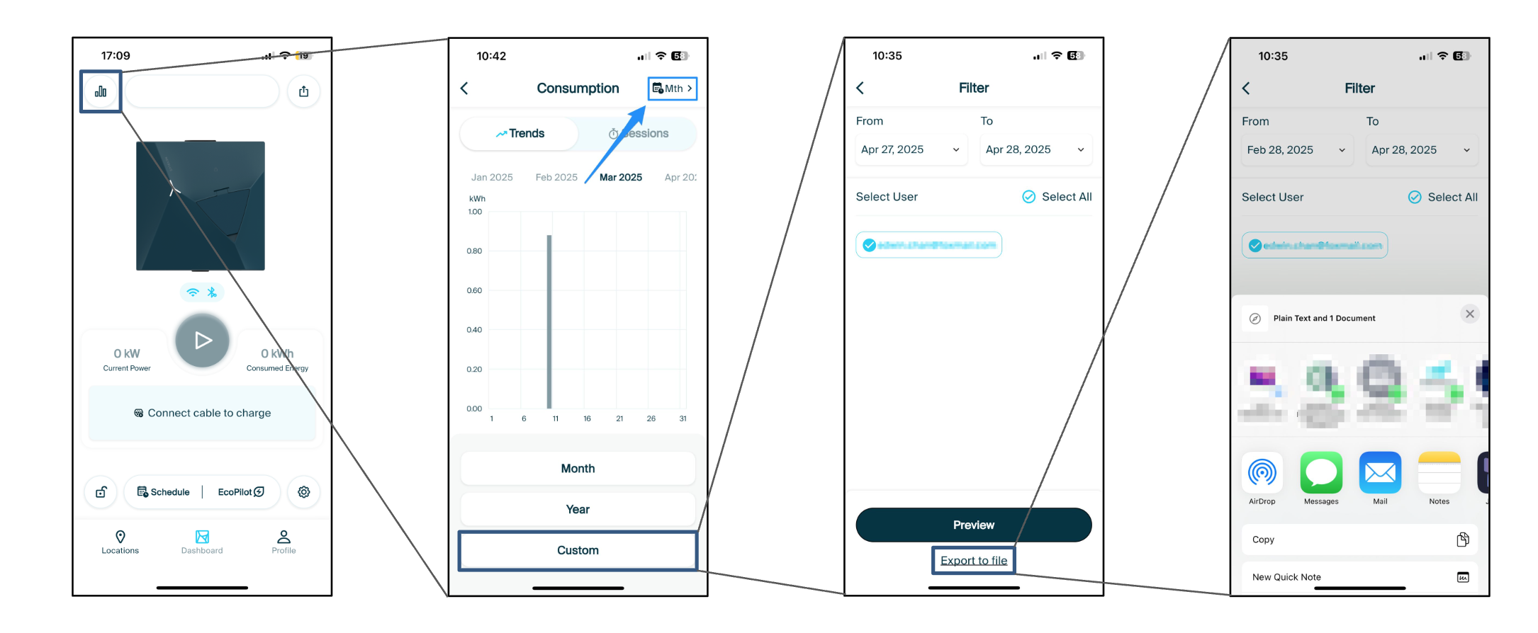 To export the data, in the myNexBlue App navigate to the charge point for which the data is to be exported for, then tap the chart icon in the top left corner. Change the data field to "custom", amend the dates as required, then tap "export to file". This will then open up the share prompt, allowing you to choose whether to download the file to the device or share it via other means.