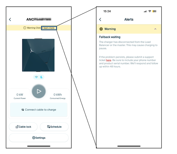 If the connection between the NexBlue Zen and chargers at the Location is broken due to the NexBlue Zen losing internet connection, or not being able to commuciate via radio frequency for a Location with one charge point installed, the Zen must get back online in order for the charge points to be used.