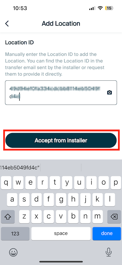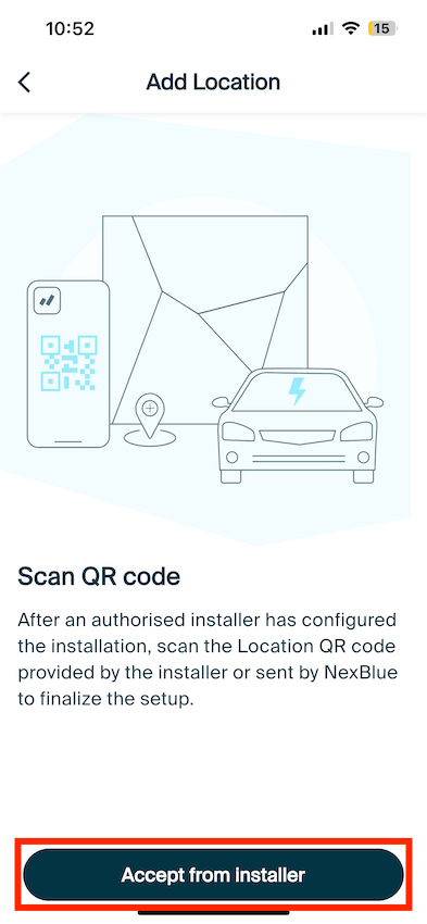 At this stage, scan the QR code either on the Installer's device, or on your email, to obtain the location ID. Once the ID has been obtained, Accept the Location.