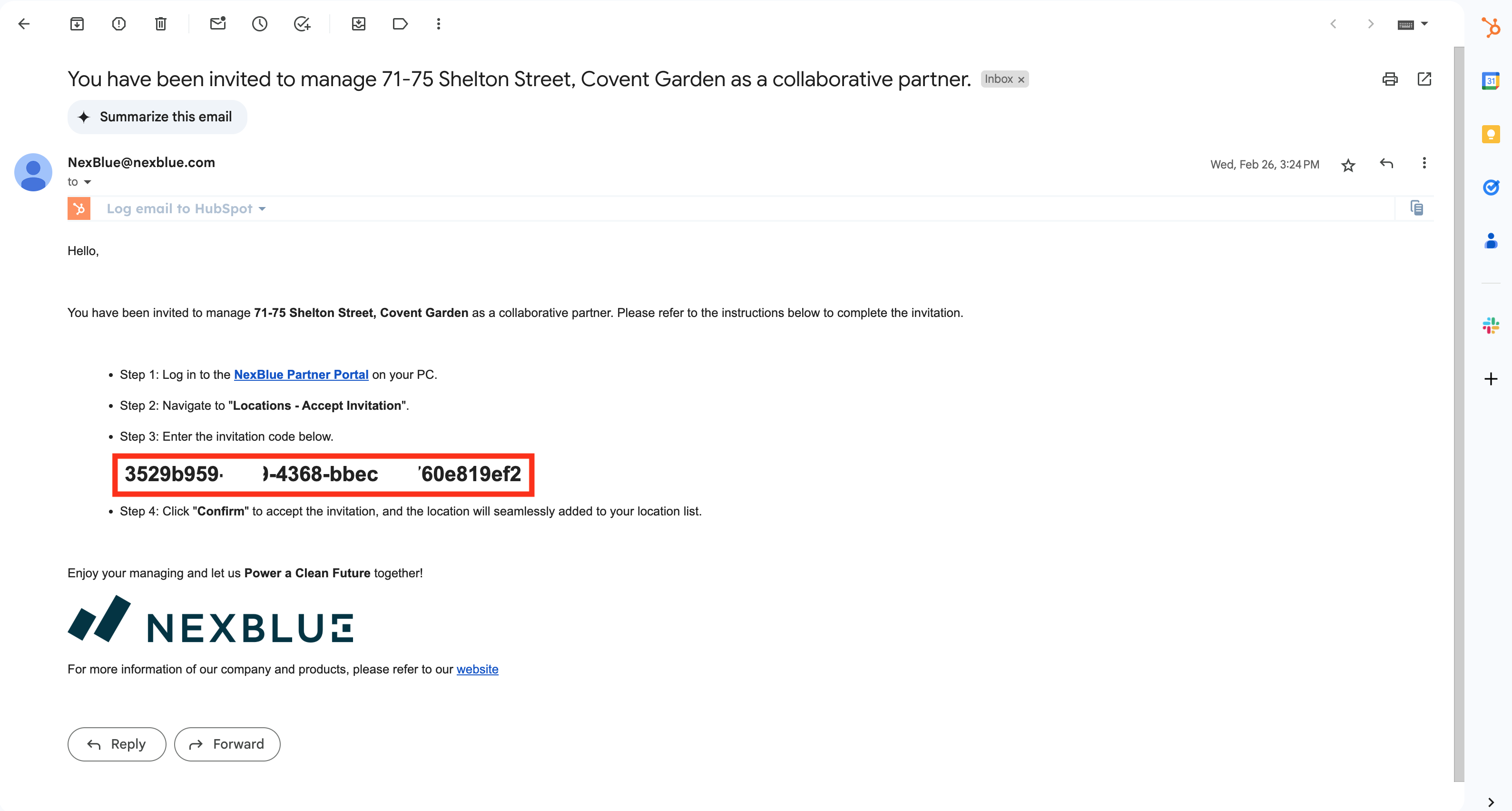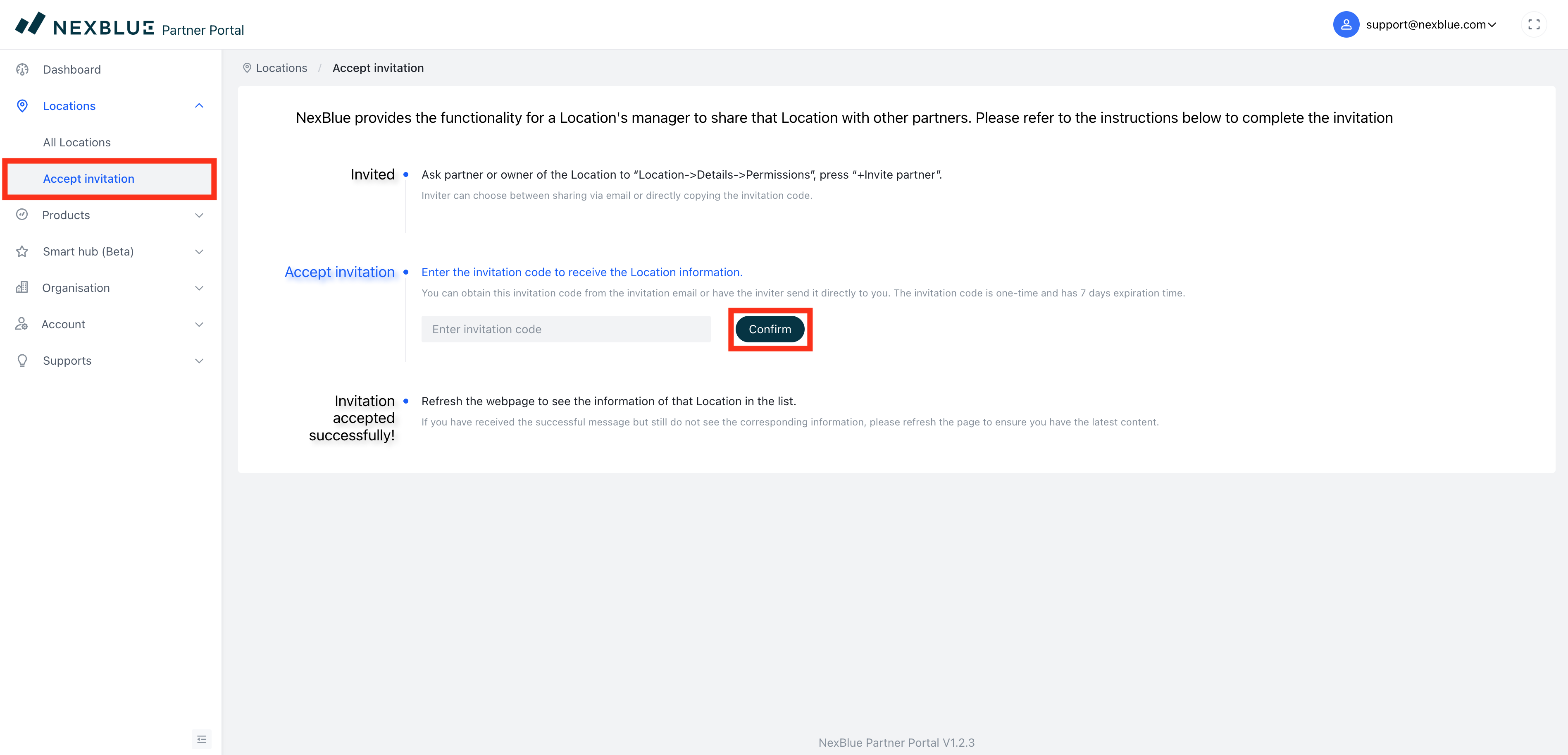 If someone wants you to have visibility over a Location that they have installed, and they are not a part of your Organisation (therefore the Location isn't shared automatically), then they will need to invite you in the portal. This process is covered in this guide. Once you have been sent an invitation code for a Location, follow the steps in the below image to add the Location. Once it's been added it will show in your list of Locations in the same way any other one would. It's worth noting that if you passed on your Organisation Key for the transfer as mentioned in the guide mentioned previously, the invitation codes will be sent to all Administors of the Organisation.
