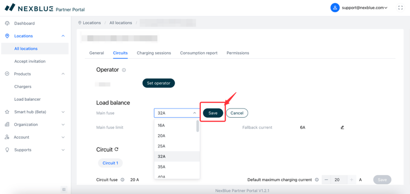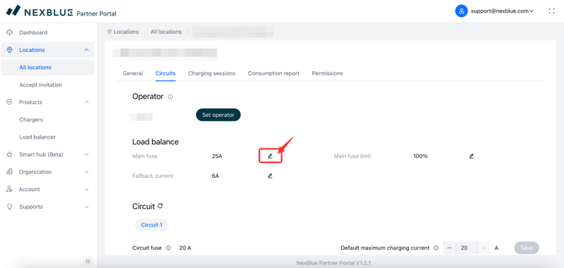 After entering the location, switch to the “Circuit” tab. Under the “Load Balance” category, click the edit button for the Main Fuse. Adjust the parameters as needed, then click “Save.”