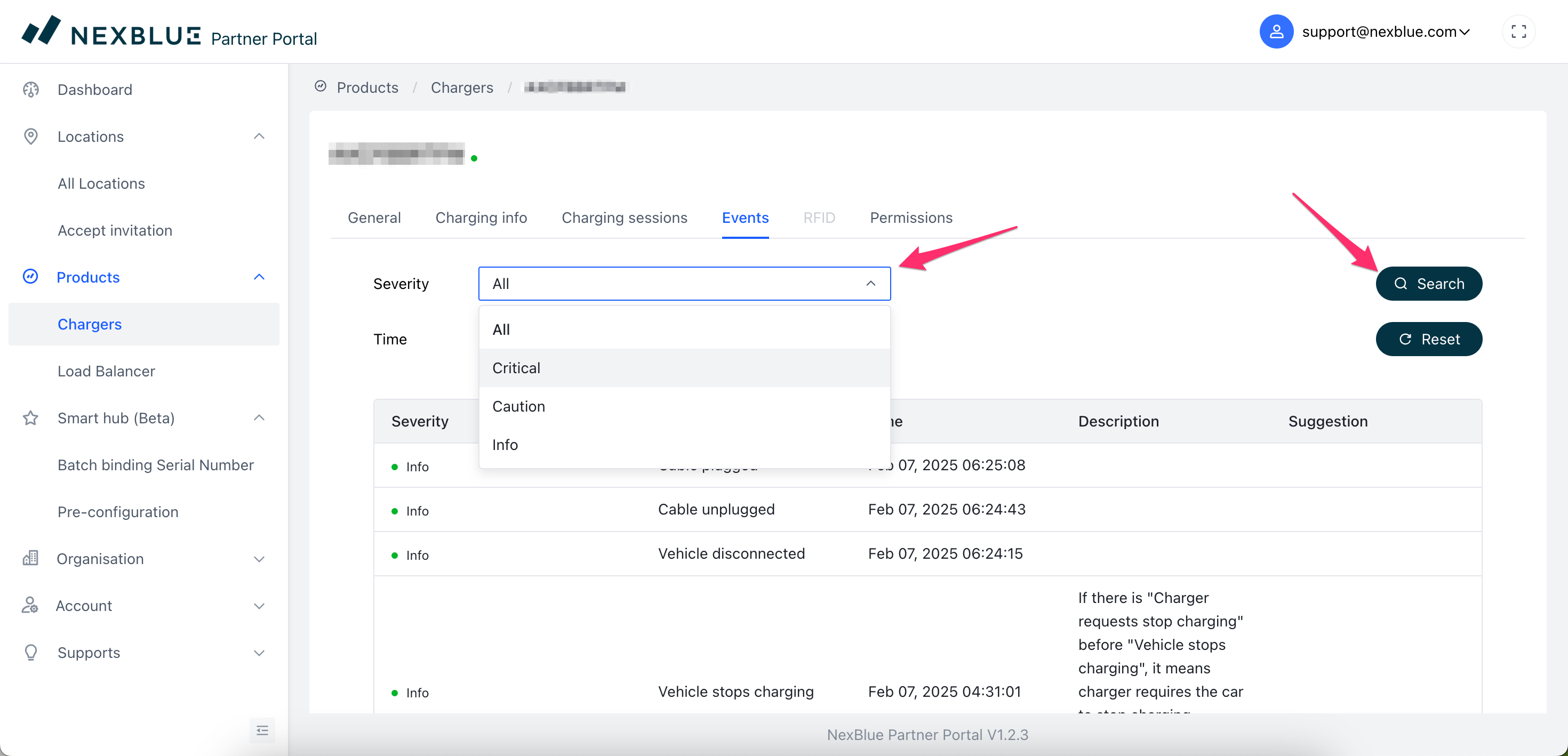You will now be brought to a page that features lots of useful information. You can scroll through all the events that the product has registered, or to filter down your search, filter the results by "Severity". If you select "Critical" and search, any events that NexBlue have deemed critical will show up for the product. Critical events include Leakage current detected, PEN fault detected, tamper detected, and many more that can be found in our Event List article.