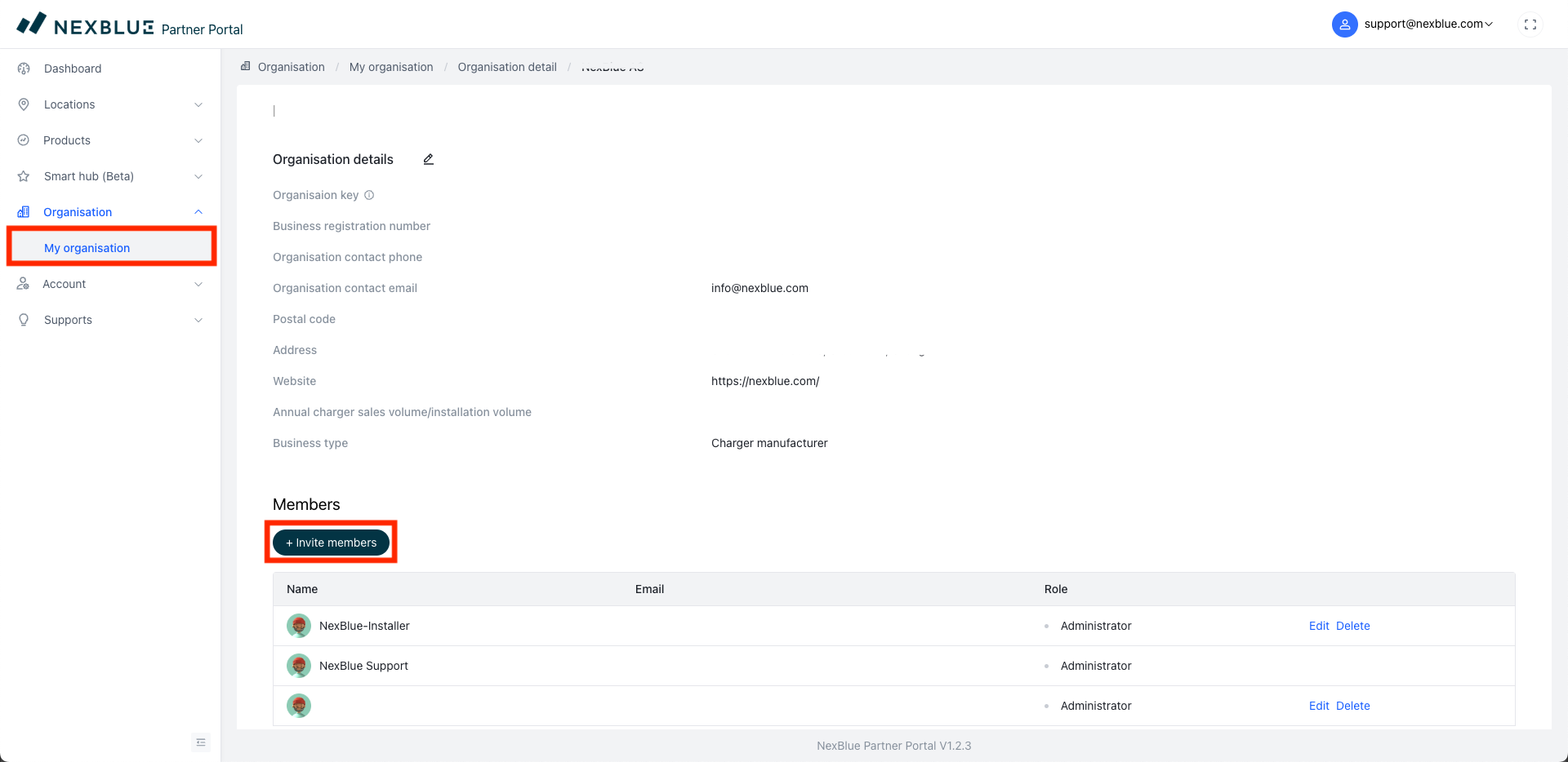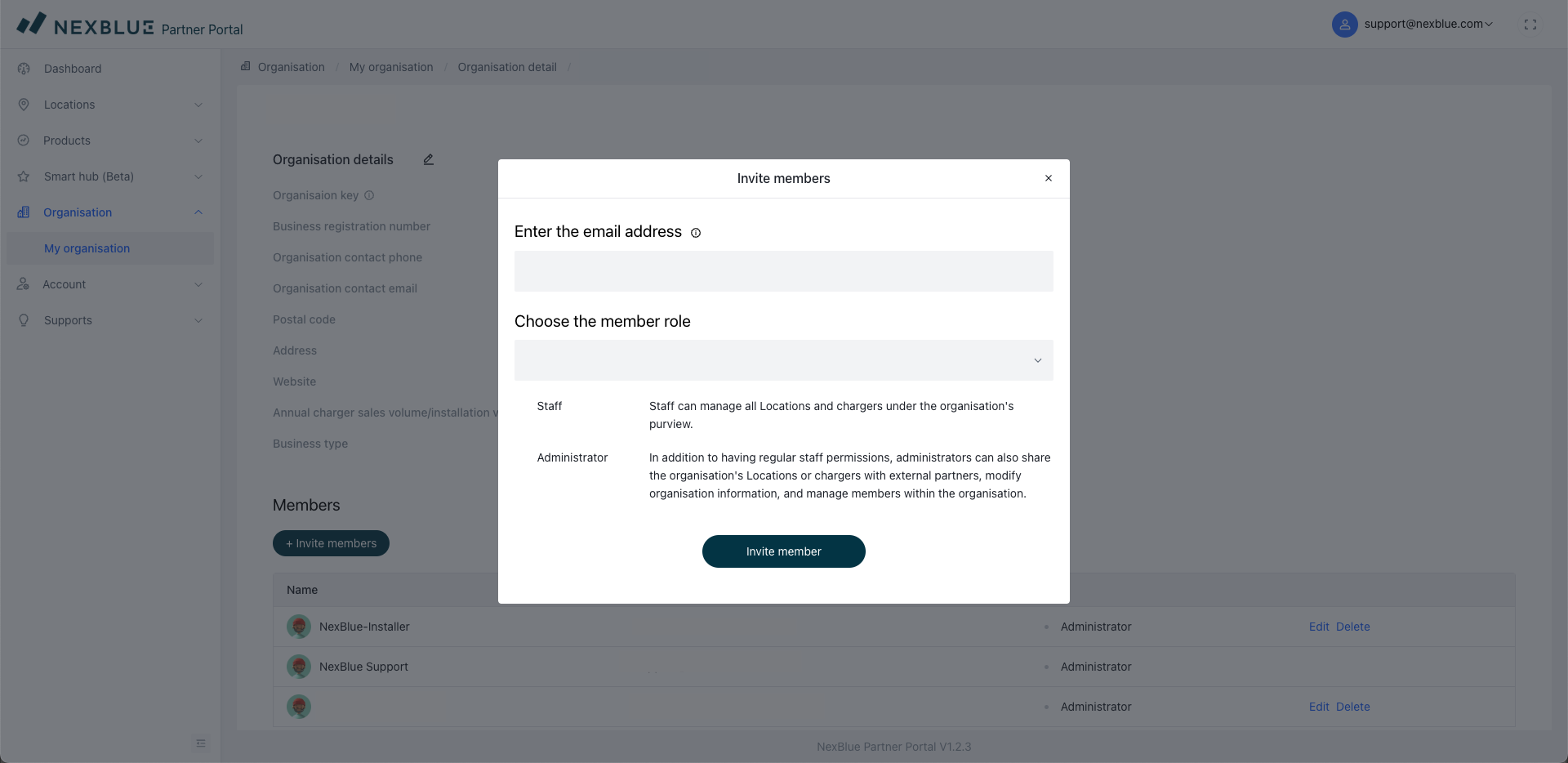 Once an organisation has been created, any member of the Organisation with "Administrator" role has full control over the Organisation, including the membership within the role allocation. You are an Administrator and would like to invite a new member to the Organisation, head to the"My Organisation" section of the menu on the left hand side, scroll down to Members, then click "Invite member"