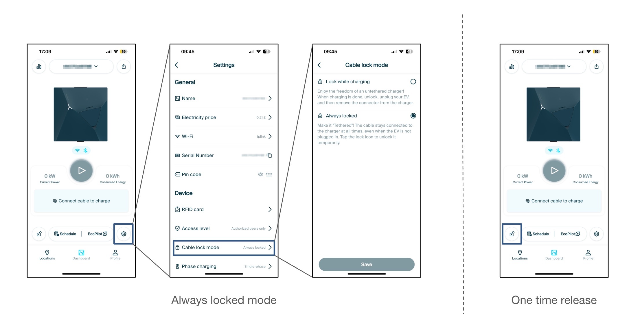 To set the charge point to "always locked" mode, follow the below instructions. This will ensure that the cable is held in place in the charge point, even when not plugged into a vehicle. To remove the cable, either change the setting back to "lock while charging", or press the padlock symbol for a one time release. If the "always locked" mode is still active, when a cable is plugged into the charge point again the padlock symbol will close and the cable will be locked in place.
