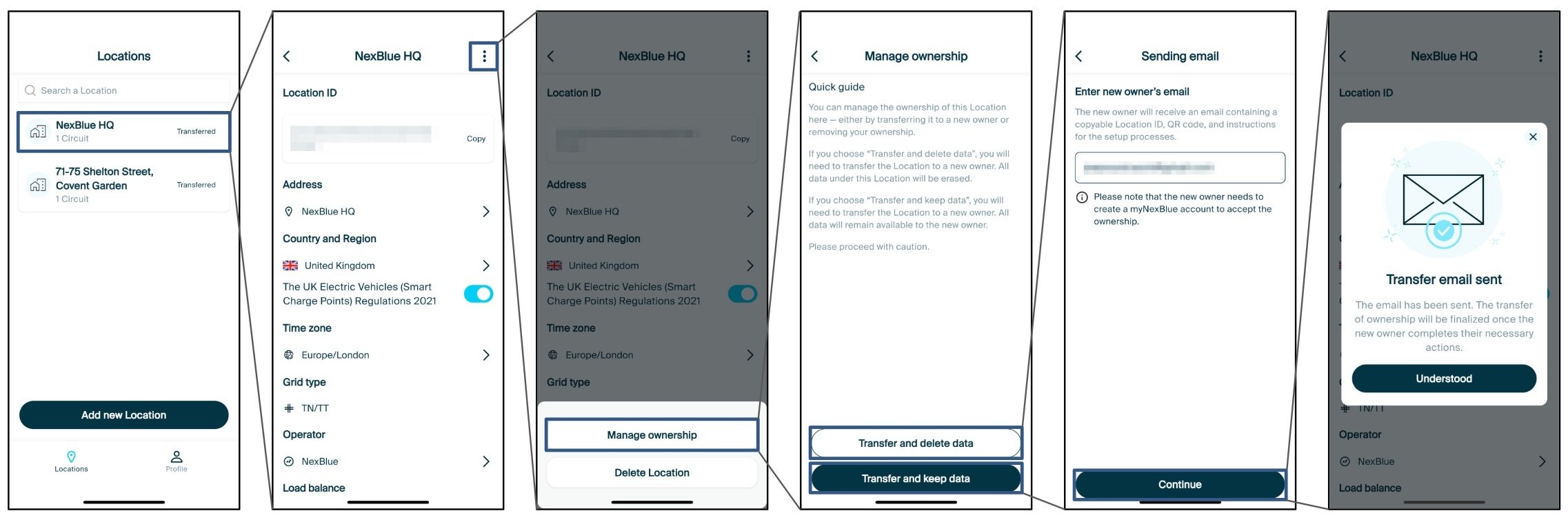 On the other hand, for a commercial site, the employee responsible for the original installation may leave the business, therefore one part of the handover process would be to transfer ownership to a different employee; this can be done through the myNexBlue App by the original Owner.