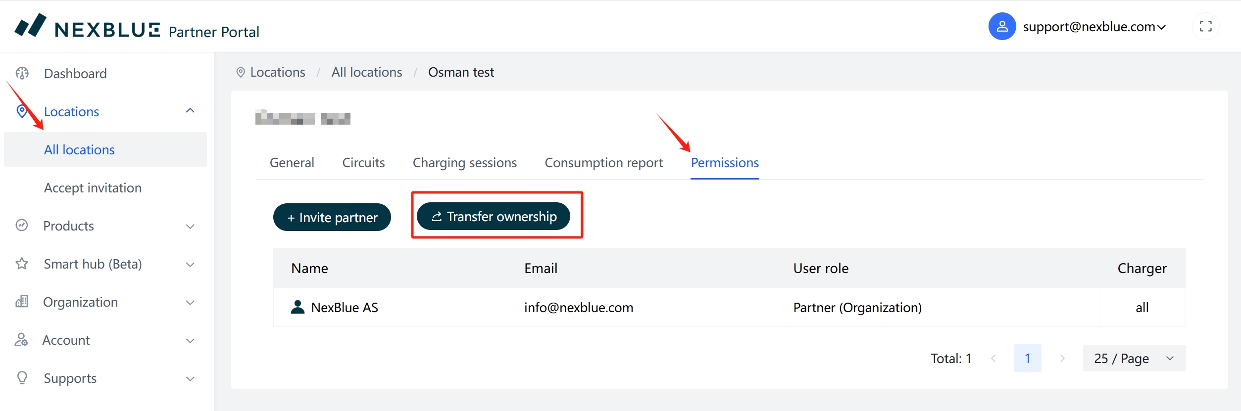 How to transfer ownership to end customer (Partner Portal) You can transfer to the customer on partner portal. Navigate to Locations->All Locations Find the Location and view its details Navigate to Permissions You will see a button to transfer