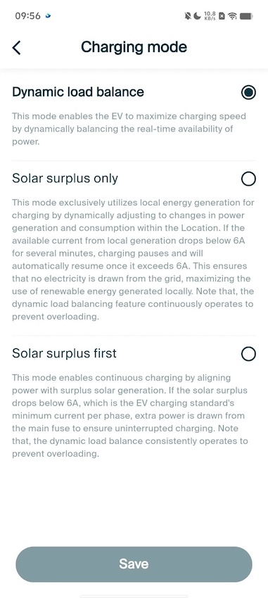 - Solar surplus first - Vehicle will change only using solar power, however if the generation dips below 6A then charger will pull energy from the grid to ensure charging doesn't stop, unlike for Solar surplus only in which charging would stop.