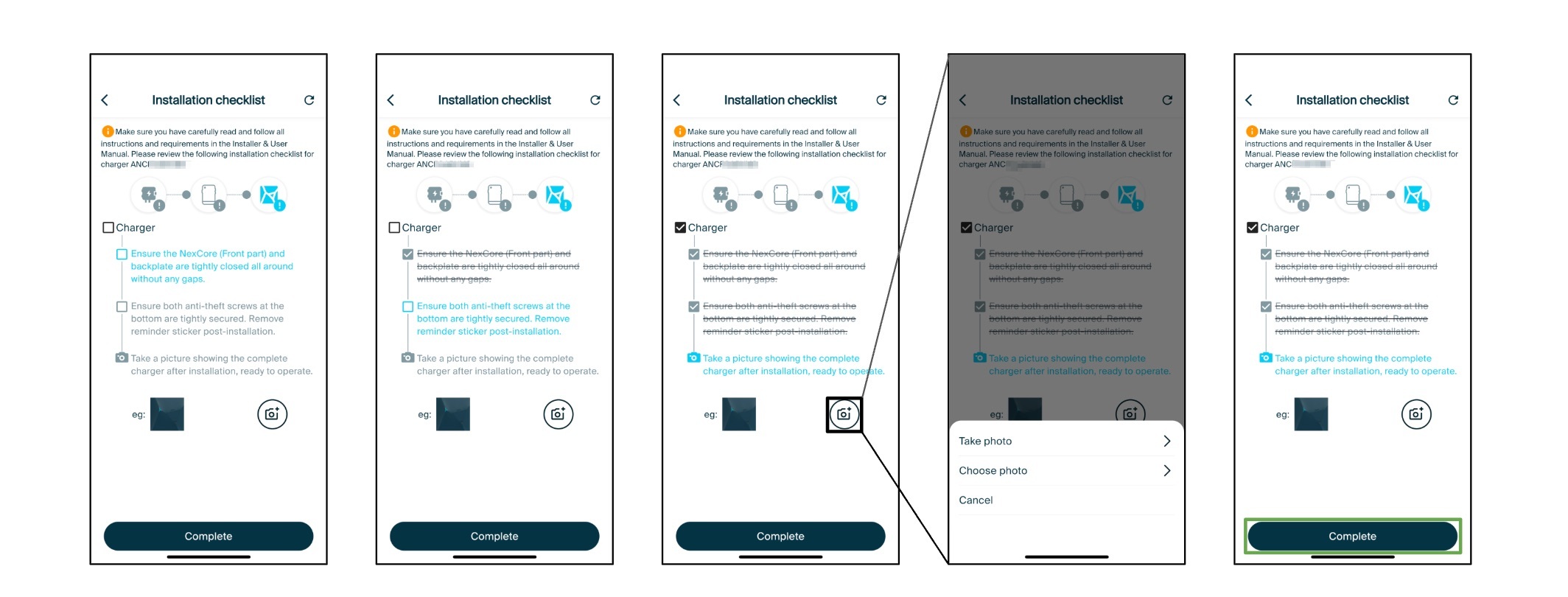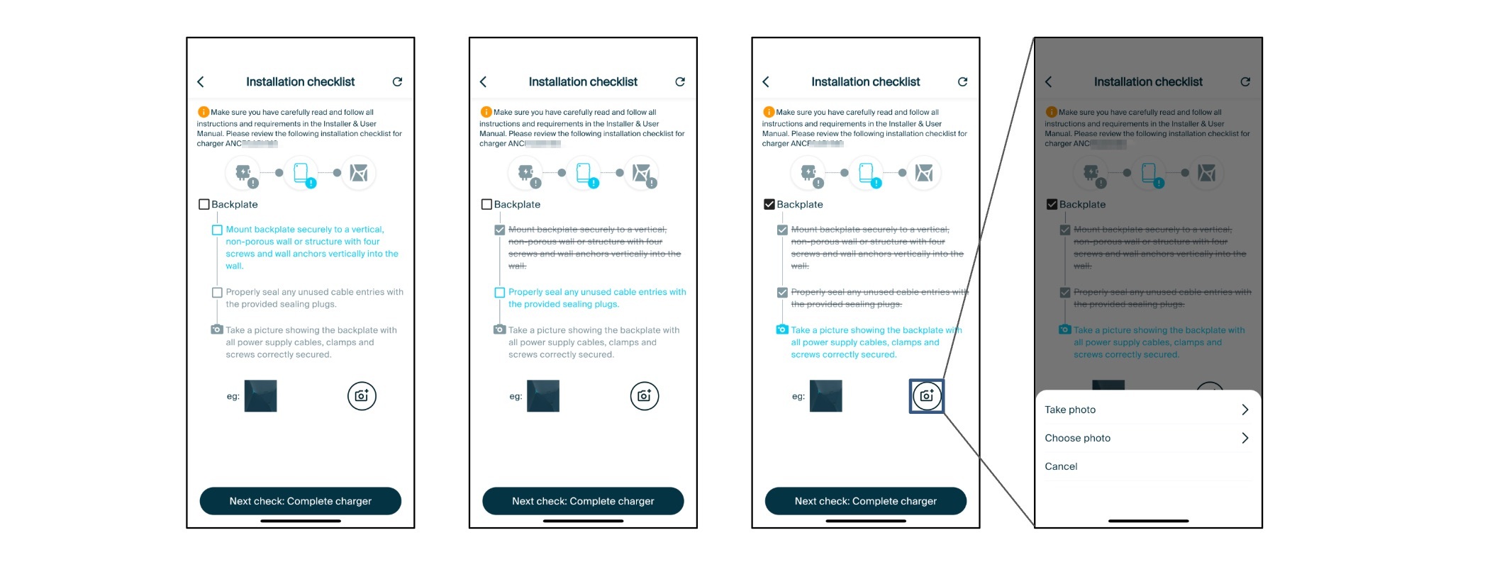 For each of these three sections, there are unique checks that are required to be completed and ticked to proceed to the next step. There is also the opportunity to upload an accompanying image for each section for later reference.