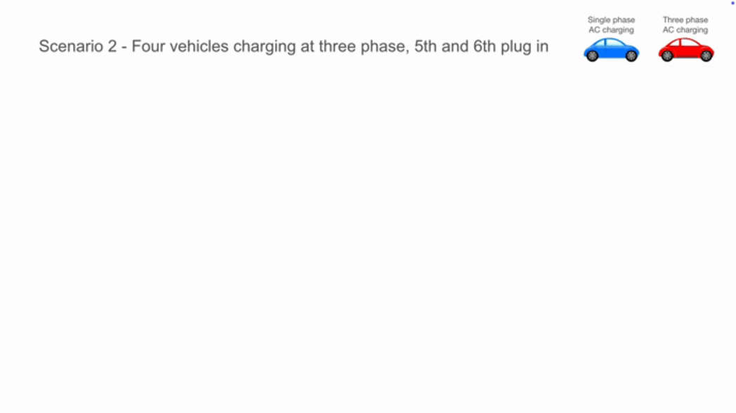 In scenario 2 things get a bit more complicated. As all the vehicles plugged in are utilising the phase phase power, were another vehicle to plug in (single or three phase) they would queue. Once one of the four cars successfully charging have finished, the queuing cars would then both commence a charge. This is because 6.25A has become available on all three phases, and as the units have been phase rotated, they can both utilise two of the additional three phases.