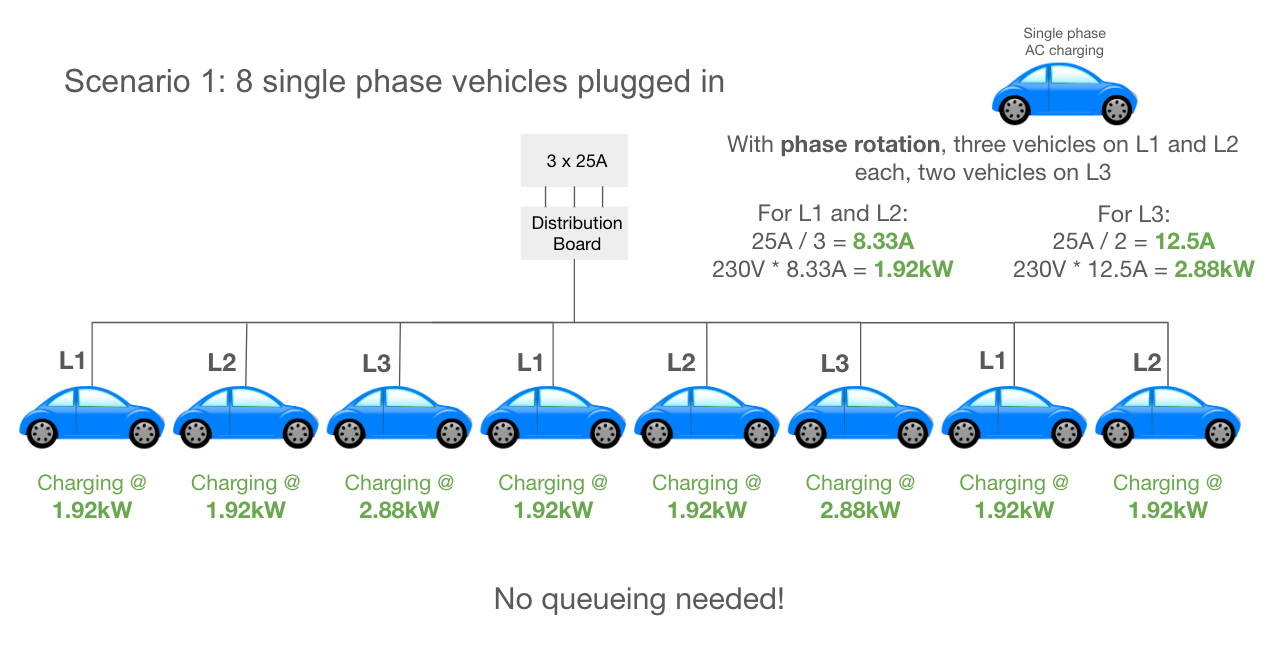 In each of the below scenarios, all charge points have been phase rotated, with L1 being used in the L1 terminal for the first charge point, L2 in the L1 terminal for the second charge point, and so on. This only impacts scenarios where vehicles are only able to charge single phase AC, as is the case in scenario 1