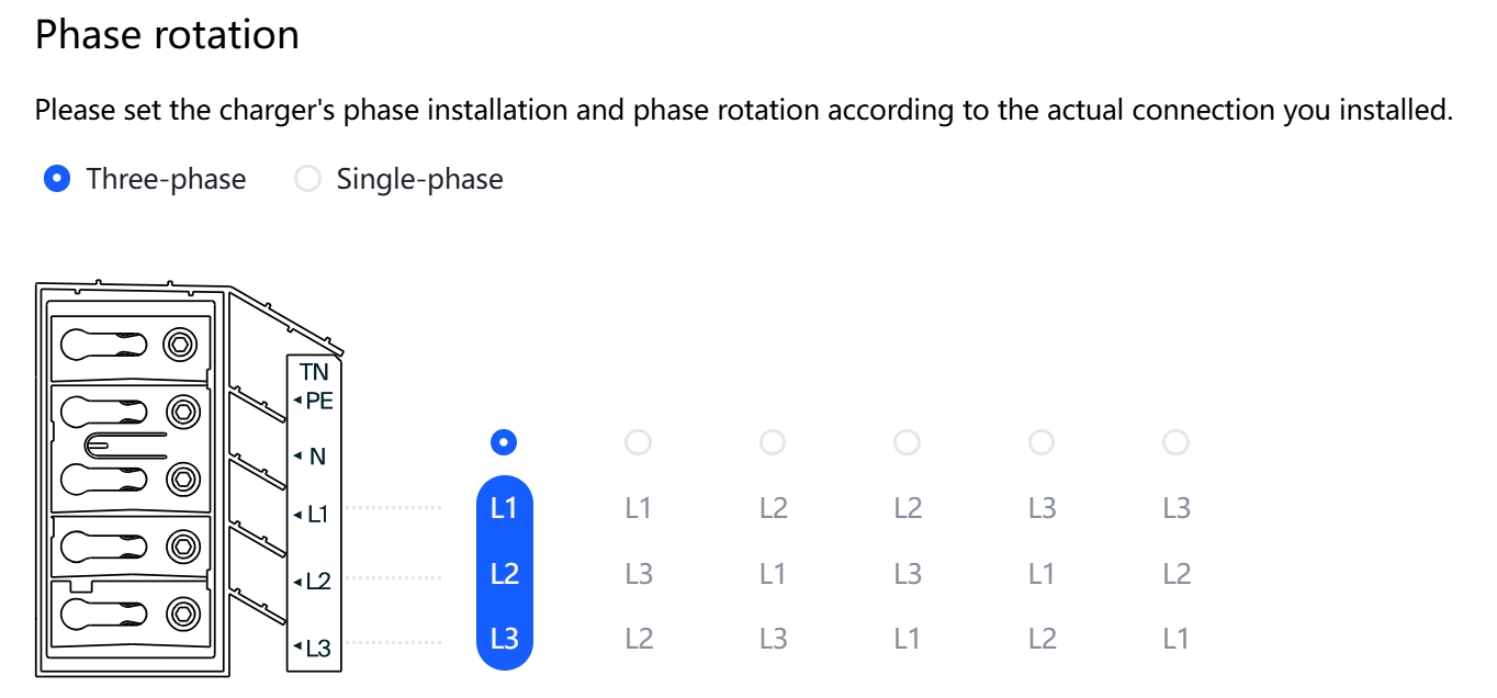 Therefore, we provide an user interface for installer to set the actual phase sequence of a charger. As shown in the diagram below: