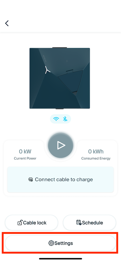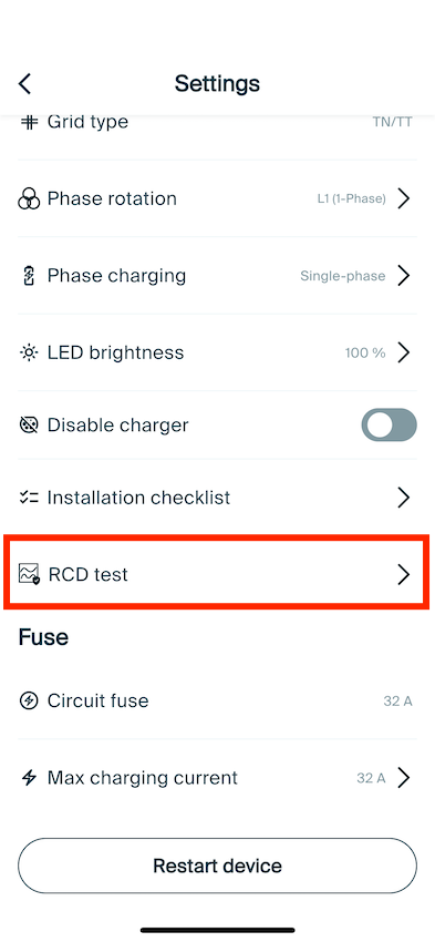 Head to the NexBlue Partner App and navigate to the charge point that you want to test. Once on the page, tap settings and scroll down to RCD test